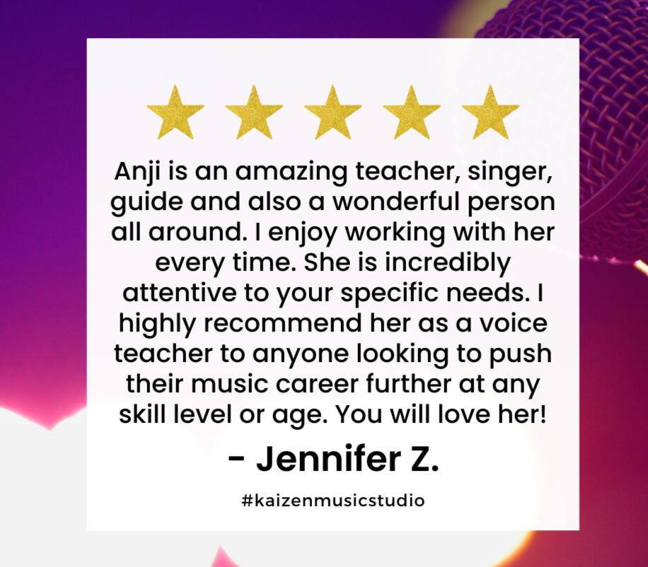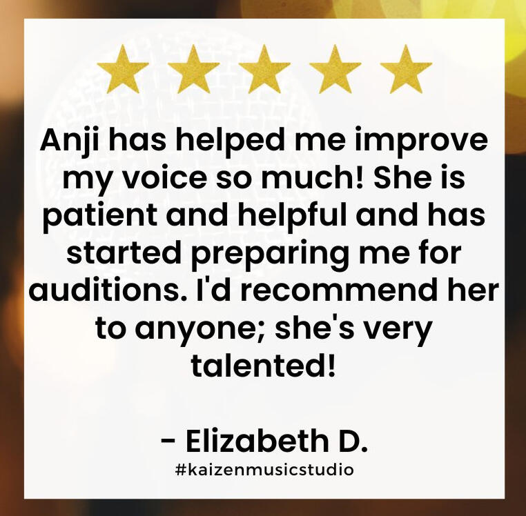 "Anji really cared about my goals & made a plan to achieve them. She showed me quick, effective ways to sing better instantly! I recommend 100%. This will be the best voice lesson of your life, I promise!"